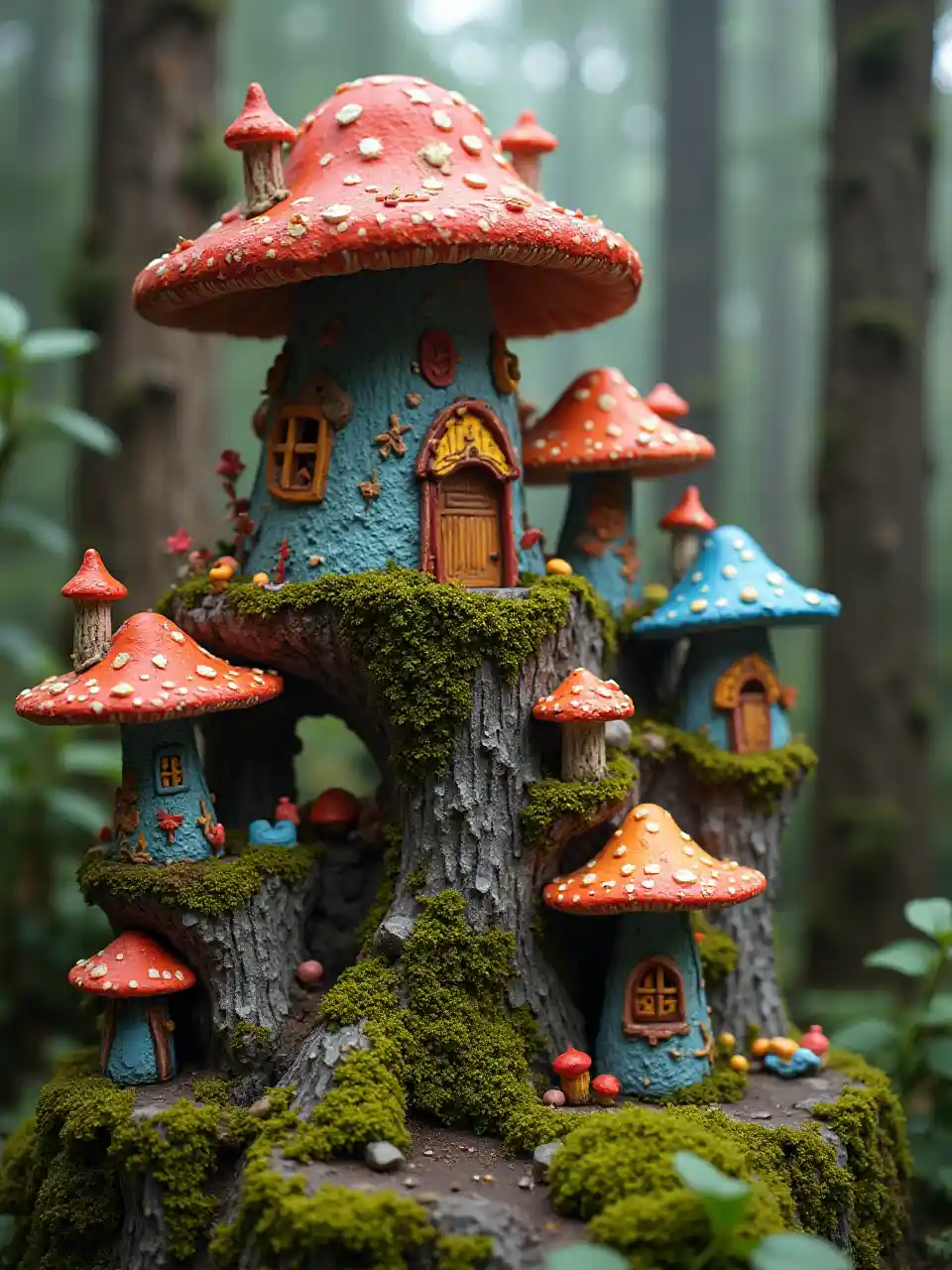 (Nero e vivamente colorato) un (piccolo mondo di creature funghe) con le loro strane case costruite sulle cime di alberi bassi, annidate tra quelli alti, che si estendono attraverso il paesaggio, coperto da un morbido, delicato (muschio naturale e altri materiali organici) che emanano un'aria di tranquillità e bellezza naturale. La comunità dei funghi si vanta delle loro case, le più sofisticate sono decorate con disegni colorati e incisioni su pareti. L'architettura della comunità riflette una miscela di stili moderni e tradizionali, creando una miscela visivamente accattivante di capriccio moderno e fascino del vecchio mondo. I membri della comunità sono incredibilmente amichevoli e cordiali, con un senso dell'umorismo che risuona in tutta la scena. Ogni casa è decorata con decorazioni colorate, rendendo ogni casa un mini cottage, che emana un senso di orgoglio della comunità e di splendore naturale.