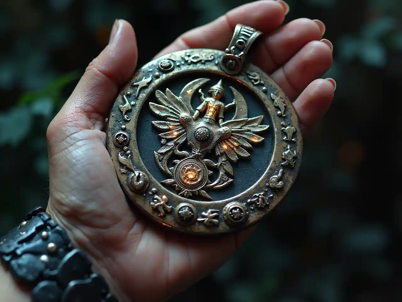 Un amuleto di 15 cm di diametro con simboli demoniaci/angelici scolpiti nel metallo, decorato con simboli magici luminosi, una mano che afferra l'amuleto dal basso, film darkfantasy, cinematico, colorato e fatasy
