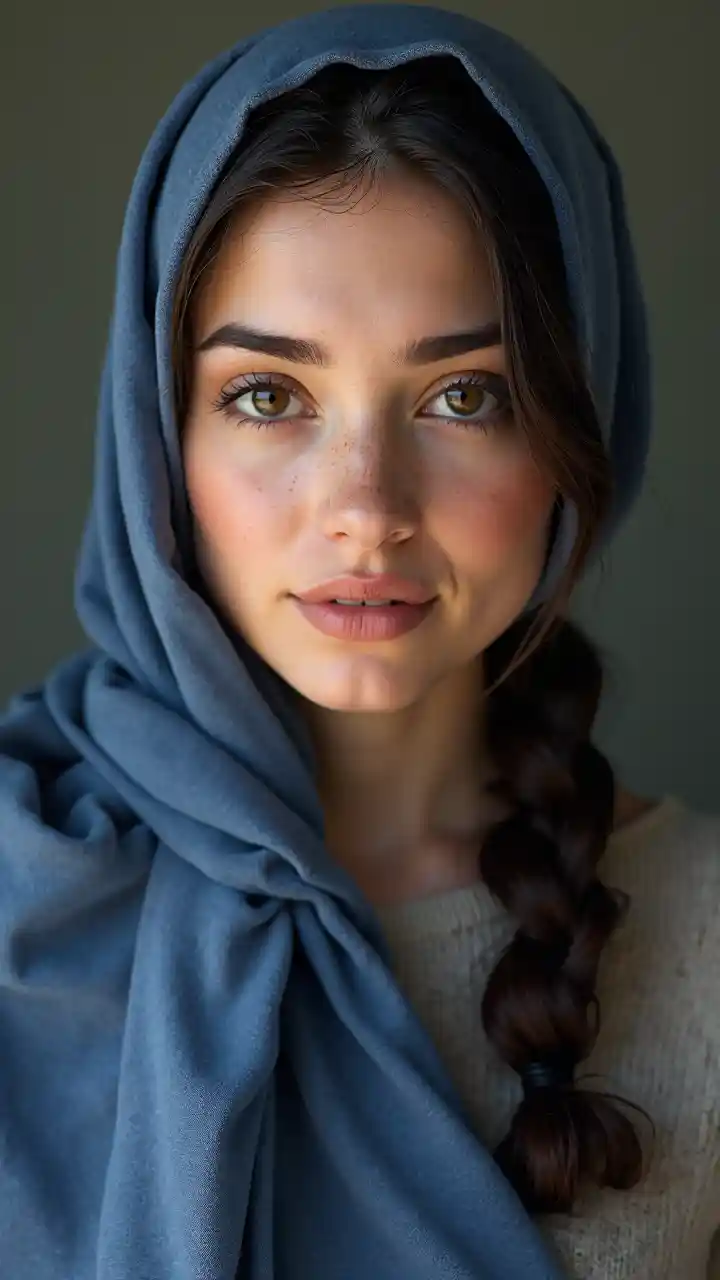 Splendida, più bella, giovane, adulta, di etnia mista, metà albanese, donna italiana, modello, senza trucco, faccia naturale, una treccia lunga, scura, legata, appesa, con gli occhi castani, con lo sciolo blu