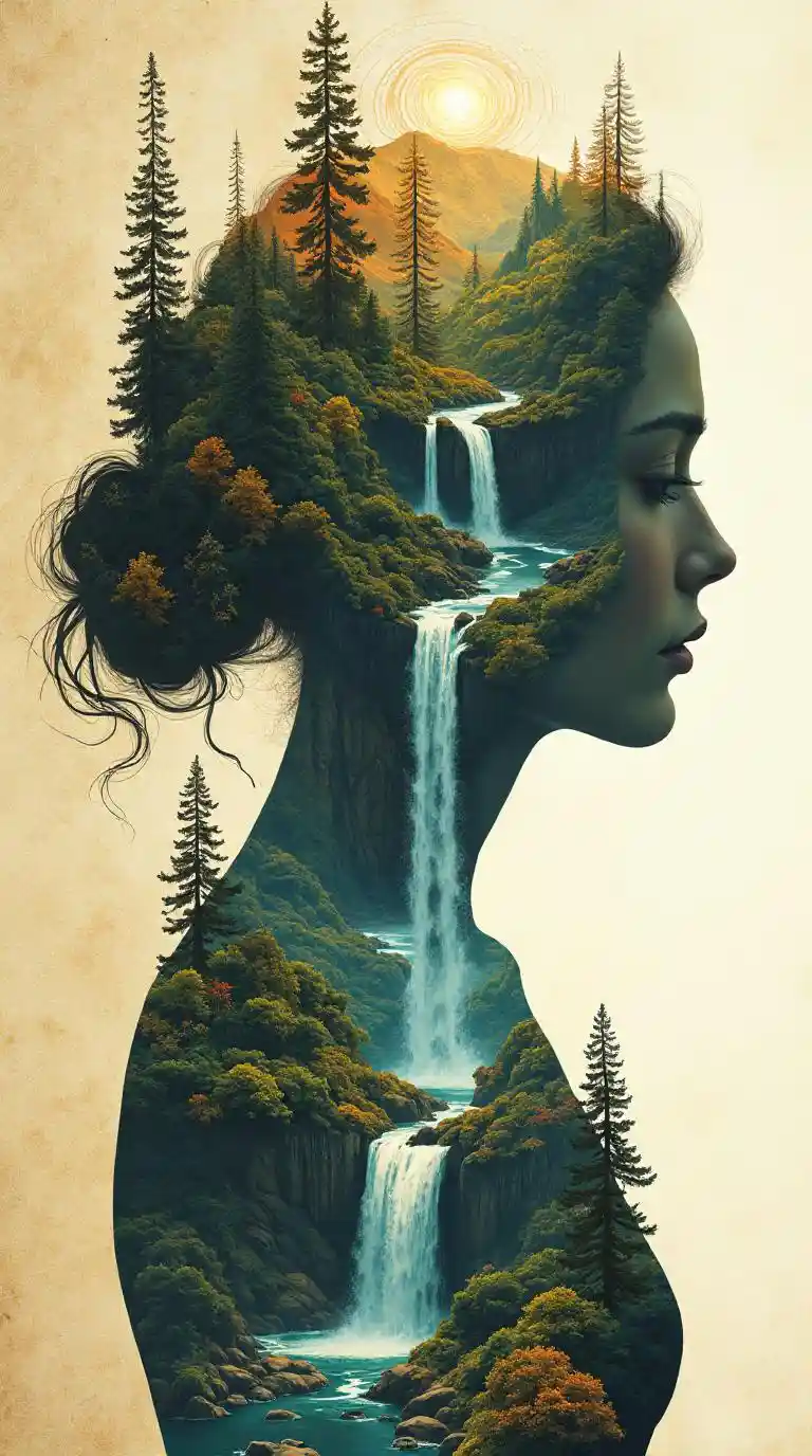 A surreal double-exposure portrait of a woman in profile, seamlessly blending her silhouette with natural elements and mystical designs. Inside her silhouette, a vibrant natural landscape is revealed: a cascading waterfall flows through lush green cliffs adorned with autumnal foliage. Tall trees rise from the cliffs, bathed in soft golden sunlight, and the waterfall transitions gracefully into her neck, symbolizing a connection between humanity and nature. Outside her silhouette, the previously blank background is transformed into a detailed fantasy map intertwined with glowing, ancient patterns. The map features hand-drawn elements such as winding rivers, towering mountain ranges, ancient ruins, and enchanted forests, all rendered in soft sepia and gold tones. Overlaid on the map are intricate glyphs, concentric rings resembling tree rings, and spiraling celestial symbols, glowing faintly with an ethereal light. The contrast between the natural landscape within her and the mystical map outside creates a striking visual balance, evoking themes of exploration, harmony, and the eternal connection between humanity and the cosmos. The composition blends realism with fantasy, inviting the viewer into a world of wonder and imagination. <lora:Anime v1.3:1.2> <lora:Blue_Future:0.9> <lora:Ethereal_Brush_Anime_v1.0:0.6> <lora:It's a LoRA for portraits, BUT! actually specialized in backgrounds. v1.0:0.2>