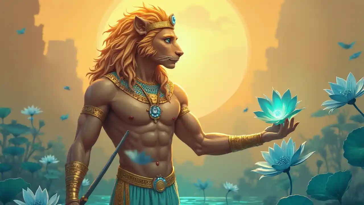 A vibrant depiction of Nefertem, the Egyptian god of beauty, standing majestically against a warm, golden sunrise backdrop, with a soft, blue-green mist rising from the primal waters at his feet. His athletic body is adorned with intricate, golden jewellery, and his lion head is surrounded by lush, blue water-lily flowers, symbolizing rebirth and creation. In his left hand, he wields a sickle sword, while his right hand cradles a delicate, alabaster perfume vase, emitting a faint, shimmering aura. His facial features are chiselled, with high cheekbones, a small, elegant nose, and full, pink lips curved into a gentle, enigmatic smile. His eyes are a deep, shimmering blue, flecked with golden highlights, gazing serenely into the distance. A regal, lion's head crowns his human form, its mane a fiery halo, radiating power and majesty. The atmosphere is serene, with soft, diffuse light and delicate, feathery textures, evoking the tranquil, dreamlike quality of the Egyptian blue lotus flower