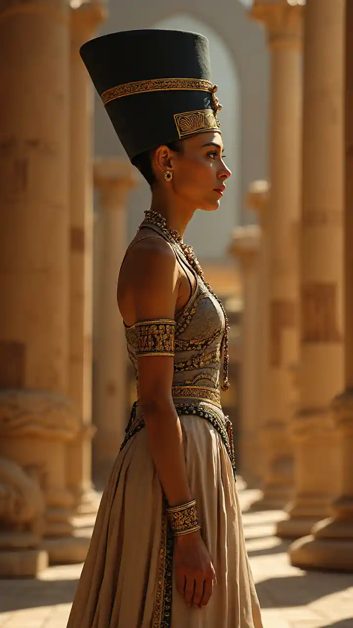 Una scena affascinante che cattura la regina Nefertiti d'Egitto nel suo elegante abito regale, che trasuda bellezza e grazia mentre si erge come simbolo di potere e femminilità, affascinante, regale, elegante, influente, graziosa, DSLR, obiettivo grandangolo, mezzano, maestoso e composto, digitale