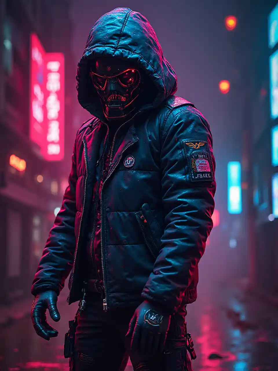 corpo intero Neon, graffiti, punk, cyber, mondo infra, meta-umano, crisi, tema oscuro, guerra civile in background, Crypto currency logos