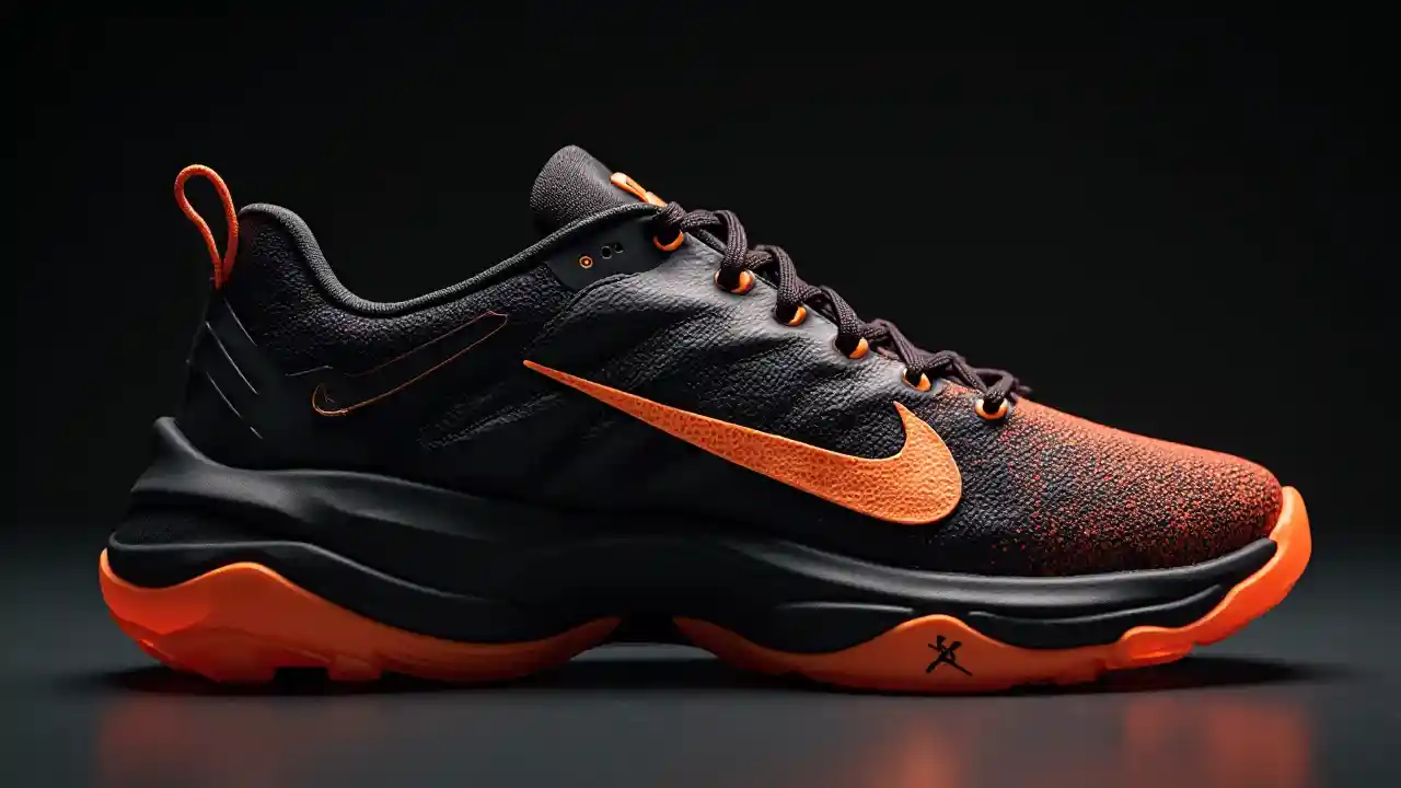 Immagine iper-realistica di scarpe da ginnastica nike futuristiche in nero e arancione con dettagli metallici, moda moderna, atmosfera profonda, saturazione, vibranza, texture e tessuti nitidi e dettagliati, sfondo scuro
