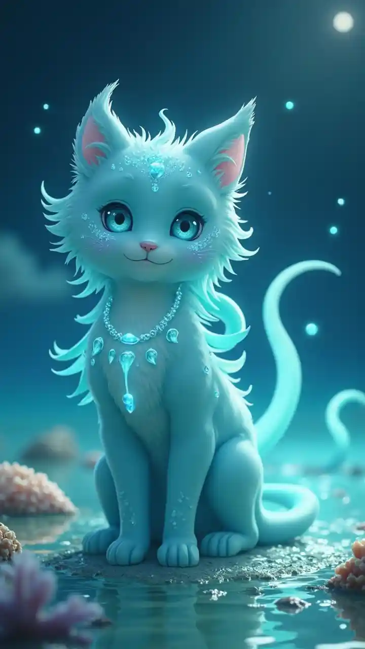 A cat-like kitsune with smooth, shimmering (((cyan blue fur))) and soft seafoam-white markings along its sides and face. Its nine long tails flow behind it like water, with a translucent, liquid-like texture that resembles the ocean’s surface. Each tail glows faintly at the tips, creating a wave-like effect in motion. Its feline eyes are glowing turquoise, deep and calm like the sea. Around its neck is a simple (((necklace made of seashell fragments and pearls))), draped naturally across its chest. Embedded in its forehead is a small, glowing (((ocean pearl))) that pulses softly with magic. It stands on a tide-washed shore surrounded by shallow water, glowing shells, and clusters of coral. Small magical bubbles float around it, and faint ripples move across the ground where it steps. The lighting is soft and reflective, like moonlight over the ocean. The atmosphere is peaceful, enchanting, and tied to ancient sea magic — this kitsune feels like the spirit of tides and whispered waves.