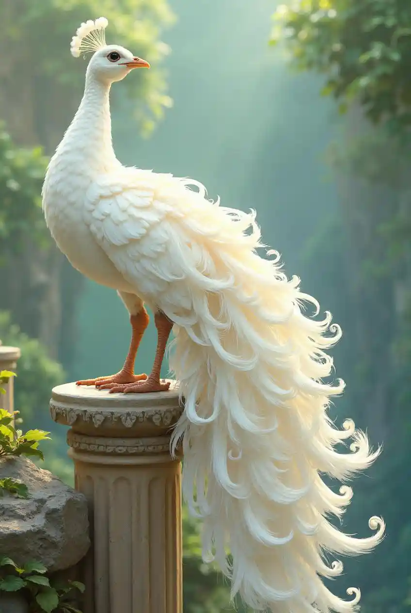Una fortezza moresca dipinta con racconti di Picasso. Generare un personaggio semirrealista con dettagli complessi, fondendo elementi di realismo con un'estetica di cartone animato. stile artistico di Beatrix Potter stile tematico ispirato allo stile artistico di Beatrix Potter: Una foto concettuale affascinante di un pavone bianco albinista, arroccato con grazia sul piedistallo. La coda del pavone, completamente sfilata, rivela un intricato e sorprendente disegno di delicate piume bianche che brillanti sotto la morbida luce del sole. Lo sfondo presenta una miscela da sogno di verdi e blu attenuati, che culmina in un'atmosfera di tranquillità e di altro mondo. Questa immagine accattivante racchiude un senso di serenità, trascende i confini della realtà e cattura l'immaginazione dello spettatore