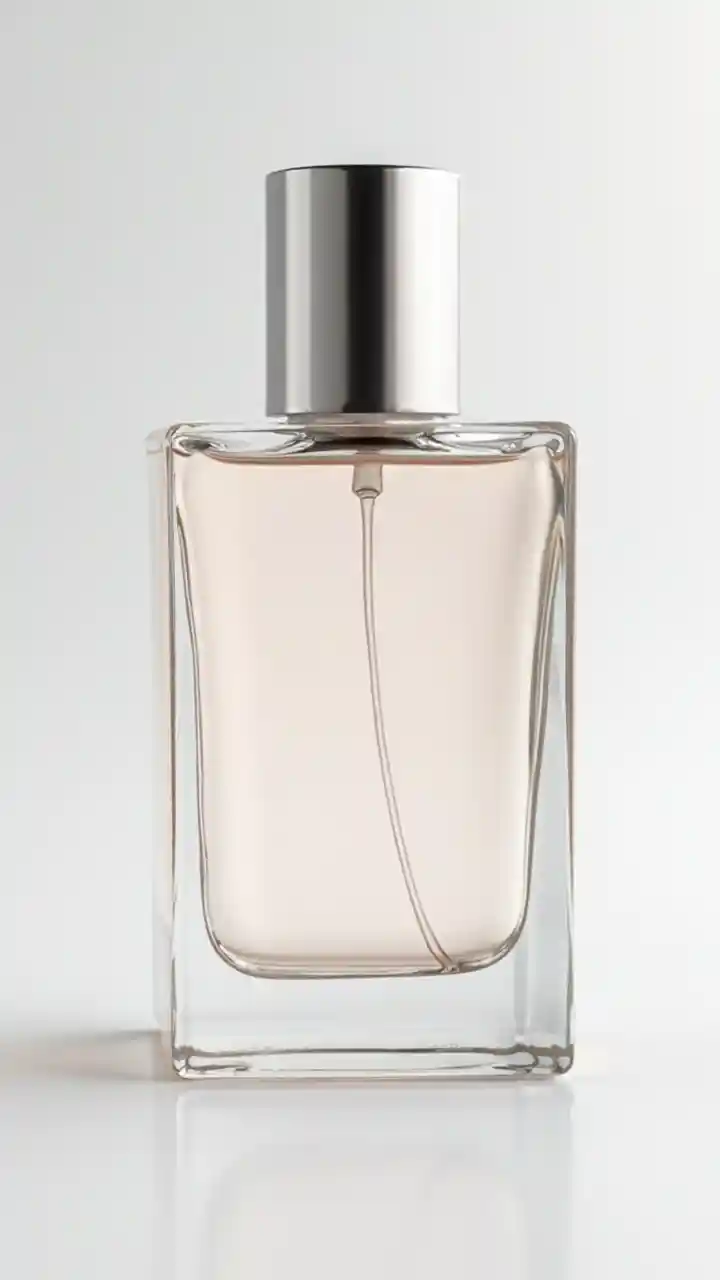 Fotografia professionale di una bottiglia di profumo di lusso, senza sfondo, senza etichetta, trasparente, mockup