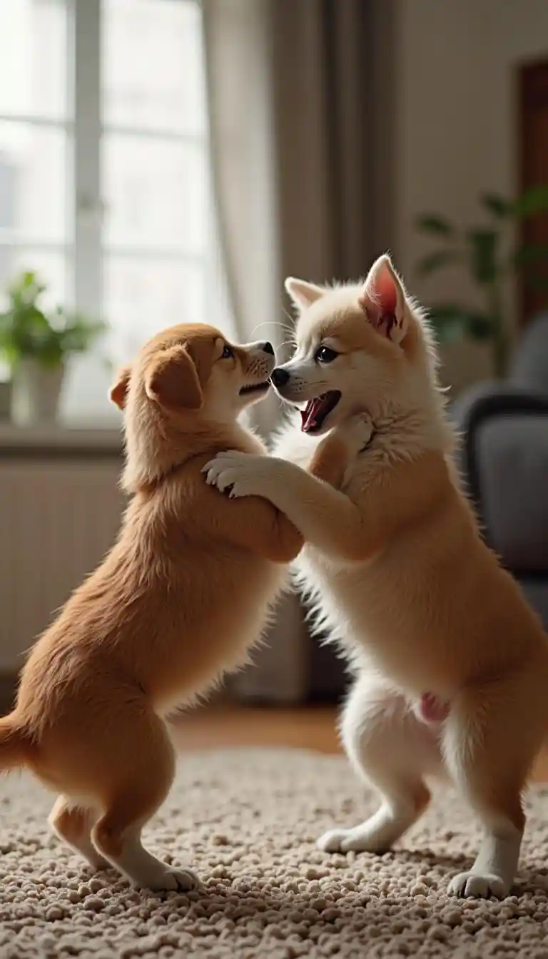 KittyCani e gatti stanno lottando nel soggiorno, carini, deformi,