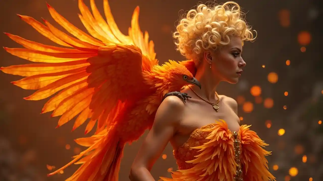 ZoeUna fenice infuocata è appollaiata sulla spalla di una drag queen di 35 anni. Ha vestiti di piume e sembra una fenice come una dea drag queen di 25 anni. - In tutta la lunghezza. Muscoloso.