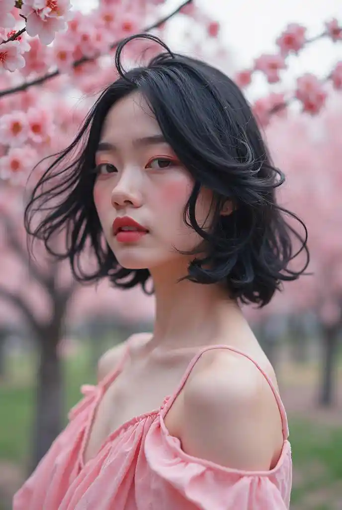 KinsleyDonna adulta Tutto lo sfondo è un albero di ciliegio Un fiore di ciliegio tempestoso visione rosa capelli neri che ballano al vento trucco in pastello