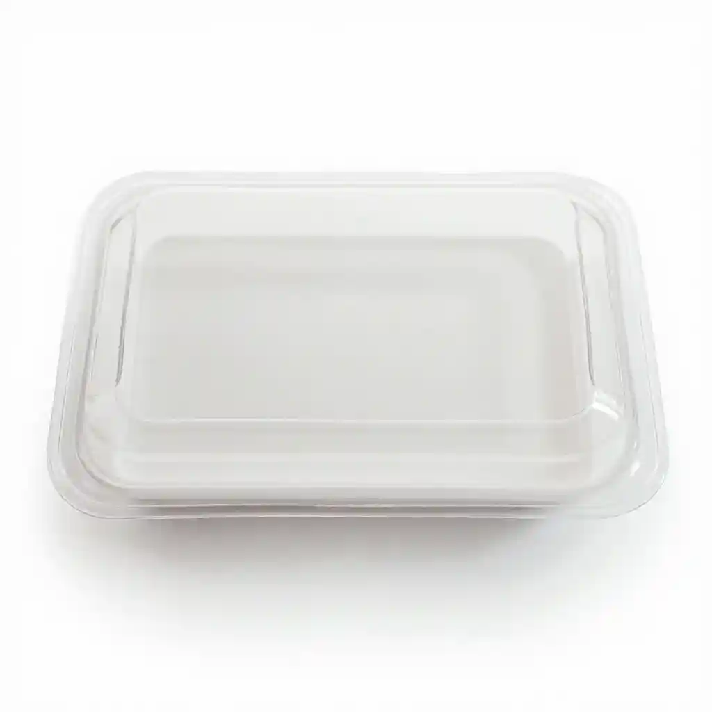 vassoio di plastica trasparente coperto da pellicola di plastica trasparente vista in alto, isolato, maco