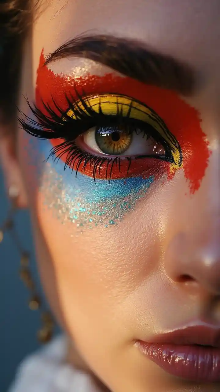Un primo piano unico, che cattura l'essenza dell'alta moda, rivelando un occhio adornato con un sorprendente design di trucco all'avanguardia, che ricorda il movimento Pop Art, con colori primari vibranti e linee grafiche audaci, che emana un'aria di audacia e creatività, che enfati, accentu, che comanda l'attenzione.