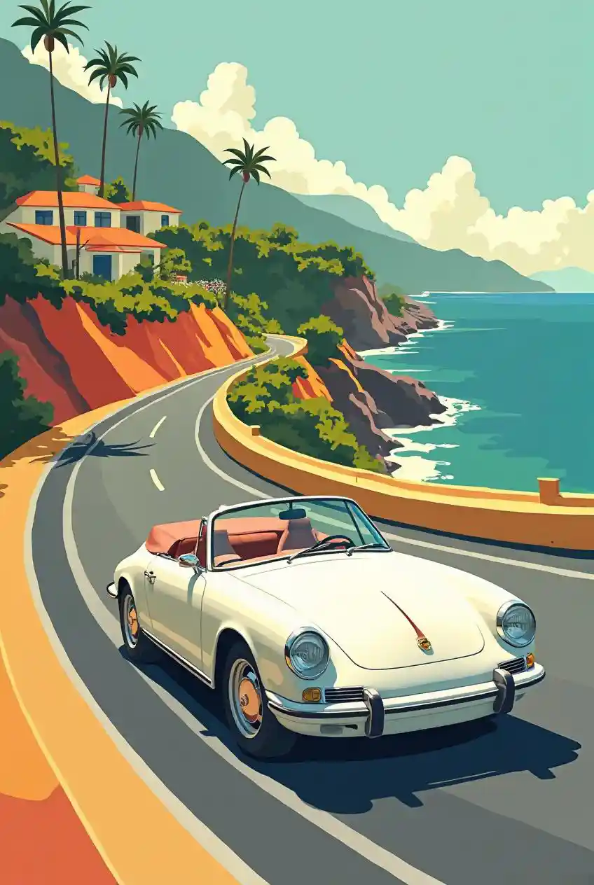 Illustrazione stilizzata di una Porsche bianca decappottabile che guida lungo una strada costiera. L'auto è posizionata in primo piano in basso a destra, in angolo verso sinistra. È caratterizzato da un design elegante con il marchio Porsche visibile sul lato. Sullo sfondo, un paesaggio vivace mostra un colorato pendio con sfumature di verde, giallo e rosso. Le palme e una villa con tetti arancioni si trovano in alto a sinistra della collina. Sotto il profilo superiore si trovano un oceano stilizzato e un cielo con nuvole bianche. La strada si curva in modo drammatico, sottolineando la velocità e il movimento con linee spazzanti che imitano le tracce di polvere. Illustrazione ispirata all'Art Deco, palette di colori piane, contorni audaci, composizione dinamica, estetica retrò con un to giocoso e sofisticato. Il contrasto elevato e i toni vibranti suscitano un senso di movimento e di avventura.