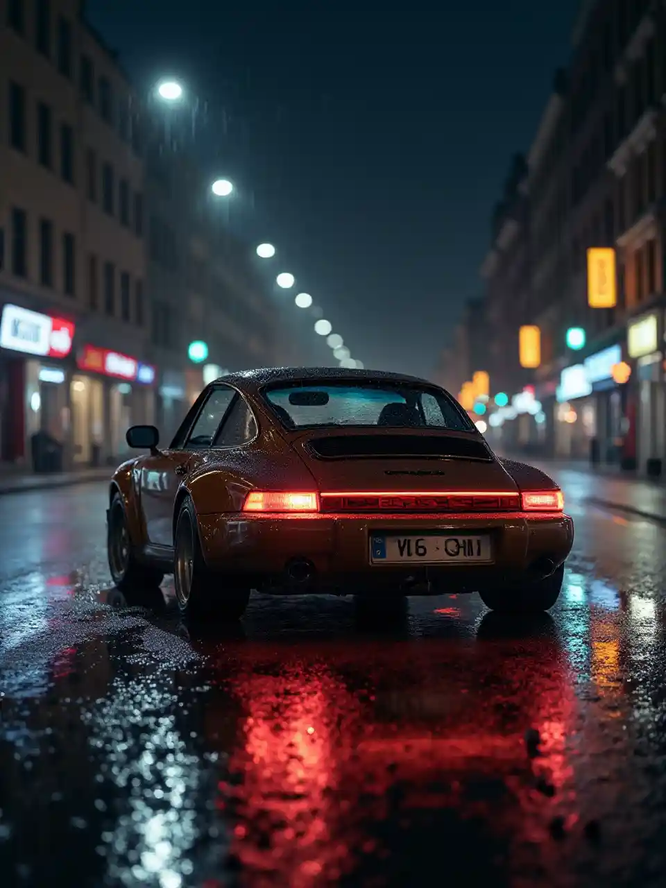 AdalynAuto Porsche che scende in fretta sulle strade di città luci di notte pioggia