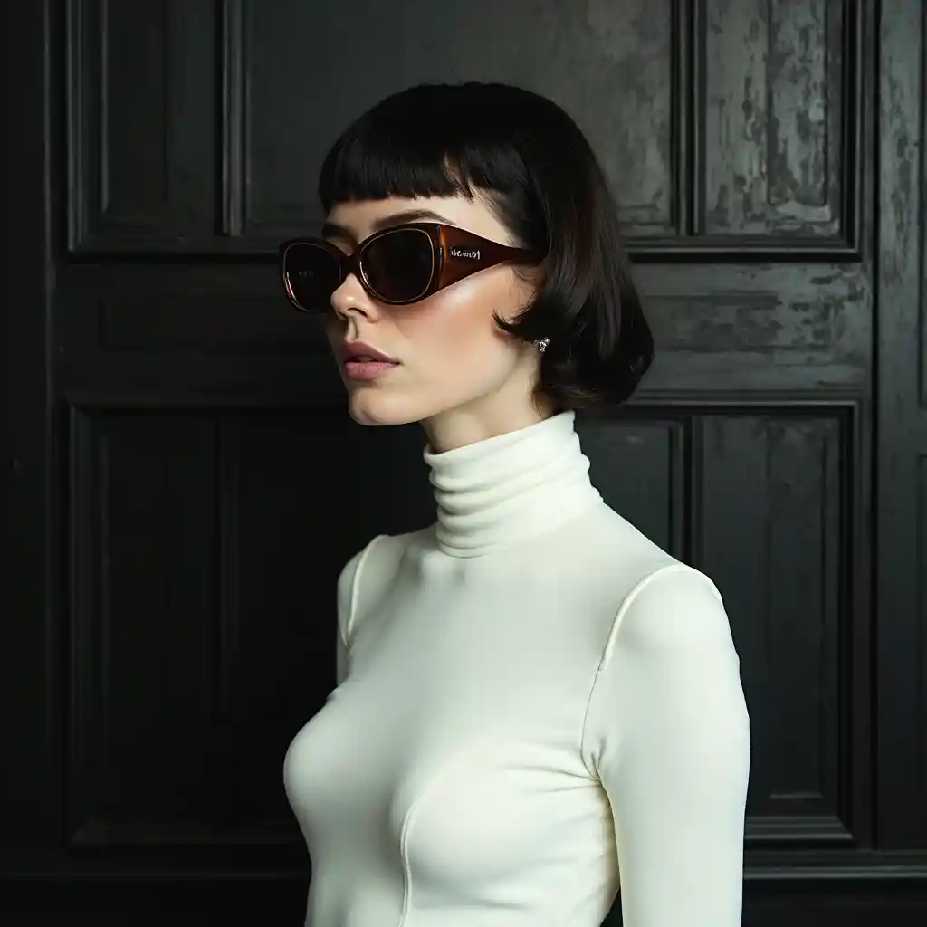 Fotografia a proiezione frontale, a metà corpo, di fronte a un muro nero, una modella punk degli anni '80 con un taglio di capelli degli anni '50, in un vestito bianco e con grandi occhiali da sole, vista a 80 gradi, arte di Sergio Lopez, Natalie Shaw, James Jean e Salvador Dali