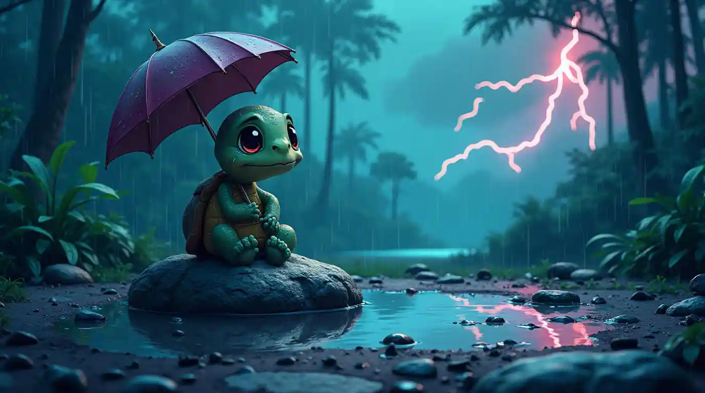 Una piccola tartaruga carina con occhi enormi in stile fumetto siede su una pietra e piange. Lei è seduta sotto un ombrello. Le lacrime riempiono una grande pozza intorno alla pietra. Il terreno ha molte pozzanghere e sta piovendo. Sullo sfondo una foresta pluviale. Molti riflessi sul terreno. Un temporale nel cielo. Luci color neon nel cielo. poche nuvole di nebbia sparsi in tutta la foto