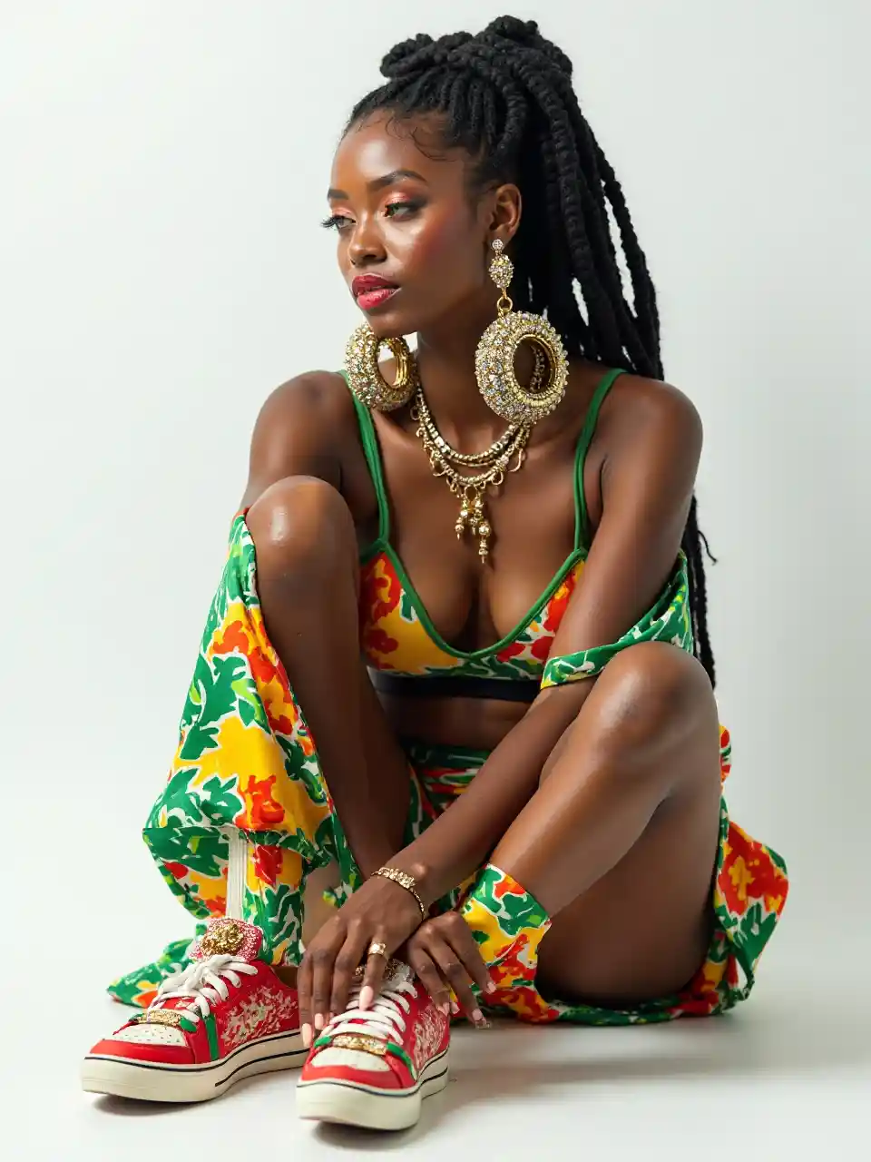 una donna rasta futurista, con la pelle di marmo, indossa scarpe da ginnastica rasta, indossa un abito rasta, enormi orecchini in cerchio con crosta d'oro e di diamante, è seduta su uno sfondo bianco