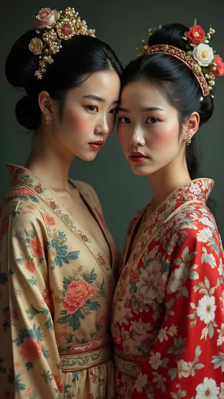 foto mezzo corpo di due donne giapponesi con abiti come la regina dei fiori,pria ha un po' di riccio, dettagli epici, realistici, raytracing, fotorealistici, foto umane, ultra realistici, capolavoro