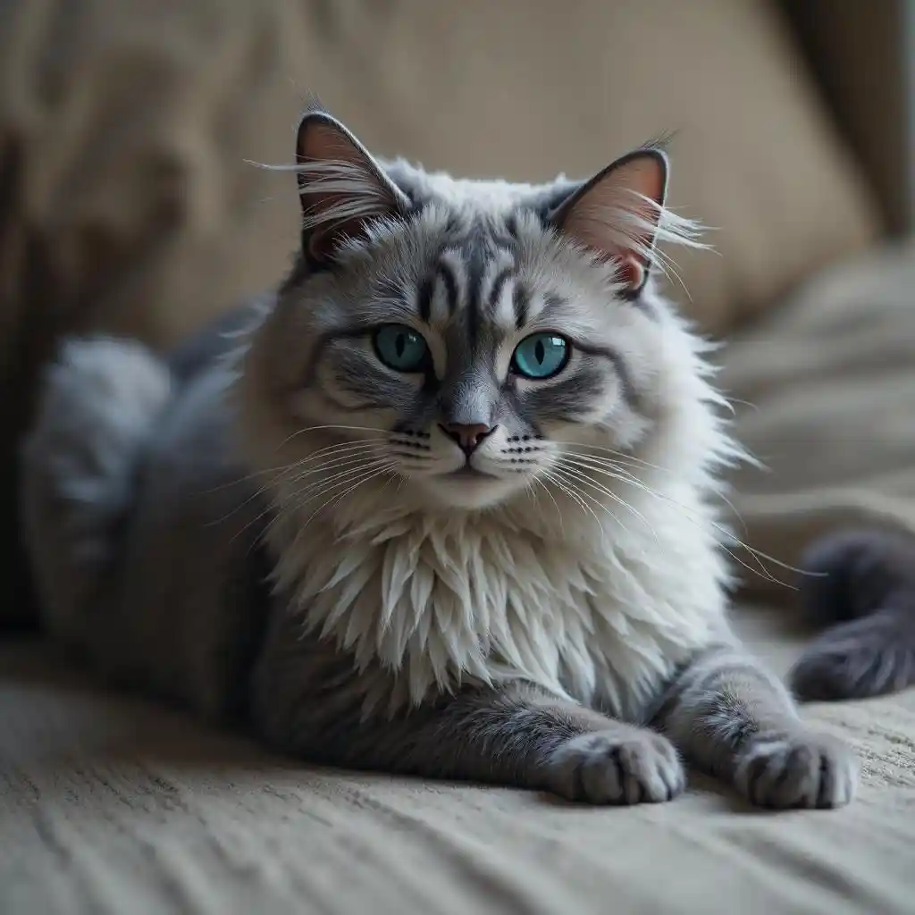 Immaginate un gatto grigio elegante e peloso con occhi blu penetranti, che siede nelle vicinanze. La pelliccia è ben curata, con un leggero pelo intorno al collo. Ha un'espressione calma e intelligente e sta guardando Zac con uno sguardo leggermente divertito e scettico. La sua lunga ed elegante coda dovrebbe arricchirsi con grazia, mostrando la sua natura regia.
