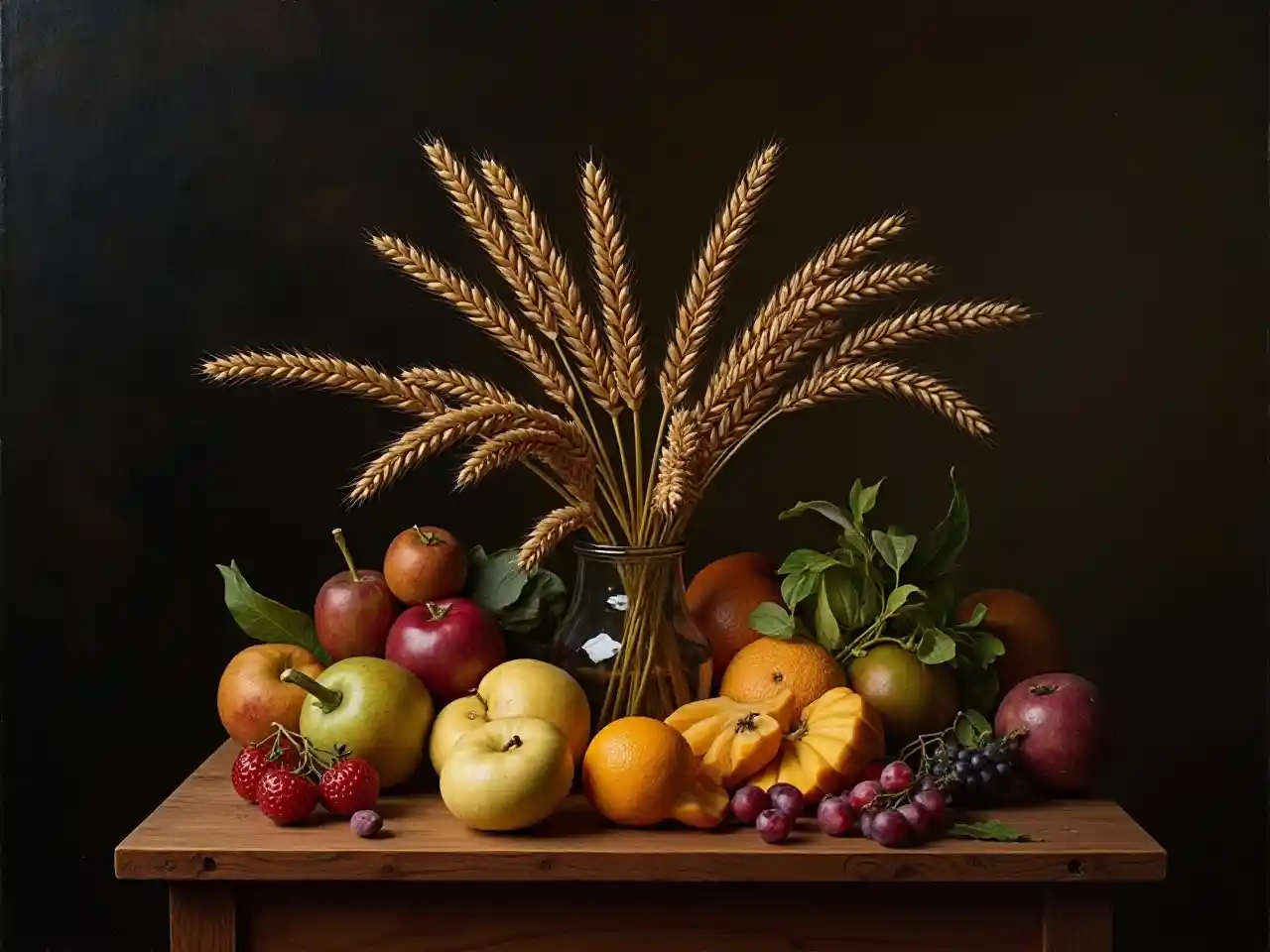 un ritratto d'arte in stile Rembrandt con frutta un mazzo di orzo e sfondo scuro