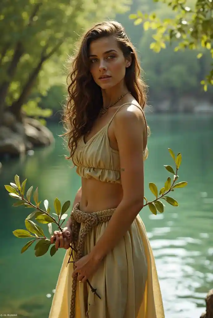 AsherFantastica scena, dove la ragazza, sexy e bella, si avvicina al fiume guardando lo spettatore, tiene un bell ramo di ulivo con bellissime foglie verdi,