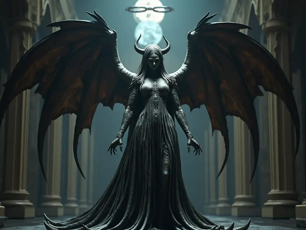 Un'antica scultura di un angelo demoniaco di nome Rucifer, ornata da un lungo velo, è raffigurata con sei ali espansi in una grande cattedrale gotica. Questo angelo caduto presenta un'aurea ombra che si alza sopra la sua forma complessa, ricordando l'estetica delle sculture gotiche e barocche. La scena è resa in uno stile iper-reale che ricorda le opere visionarie di Guillermo del Toro, mostrando dettagli di tutto il corpo e una prospettiva epica. Le tecniche di rendering Zbrush e octane migliorano l'illuminazione volumetrica e cinematografica, catturando l'essenza della scultura con dettagli fotorealisti. Lo sfondo presenta il pianeta Terra sottile, che aggiunge profondità alla scena oscura ed epica. L'intera configurazione è stata accuratamente composta con precisione tecnica ultra dettagliata, seguendo la regola dei terzi. Questo rendering in 8K, eseguito in Unreal Engine 5, mette in evidenza le caratteristiche ornate e intricate delle trame ossee in un contesto basso contrasto, composizione elegante e scuro.