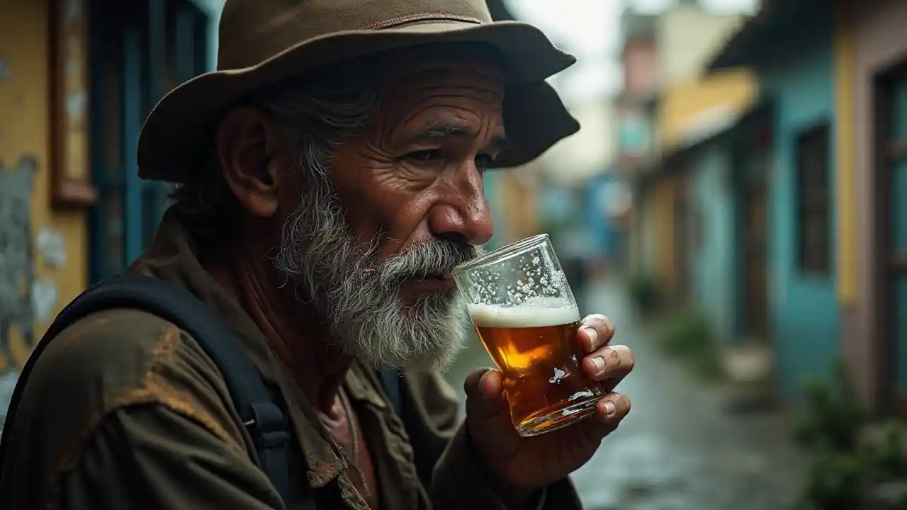 Un vecchio, un povero, che beve birra, con gli occhi tristi, piovoso, soggetto, nel fondo di una favela.