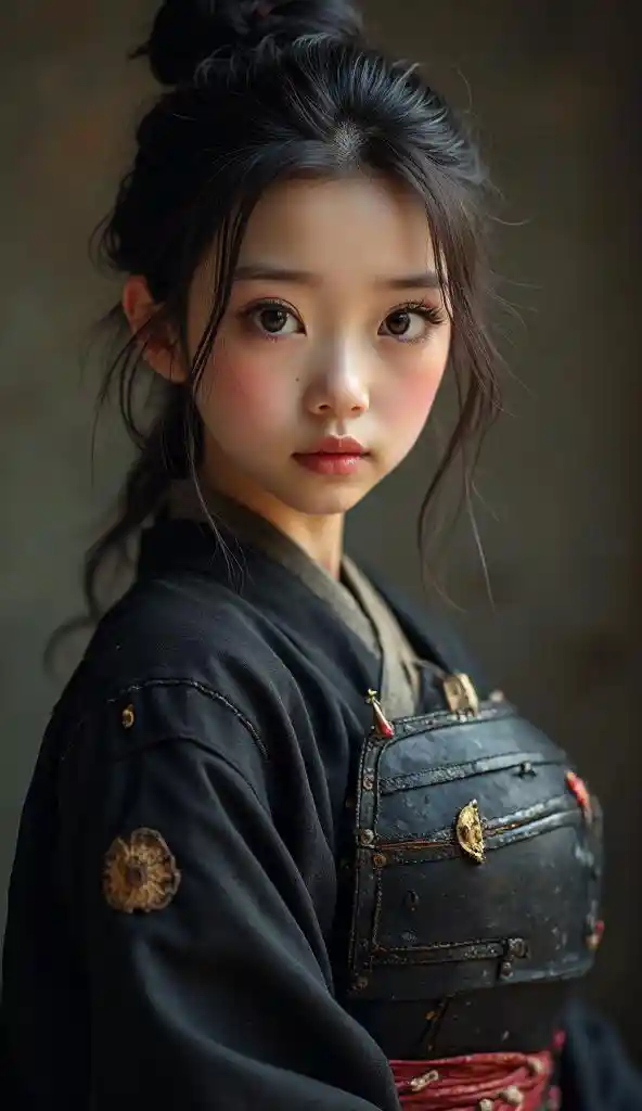 WilliamRagazza giapponese forte e adorabile, con un viso delicato, un'espressione dolce, un grosso busto con curve elastiche, un'armatura da samurai, un ritratto in kimon nero