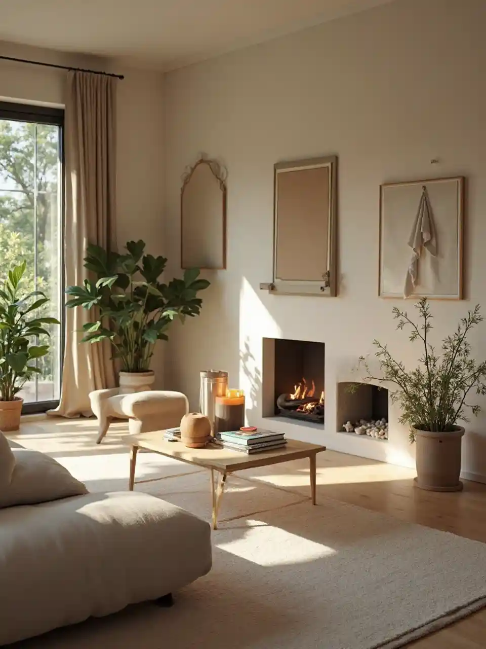 Uno stile di design d'interni primitivo per i tempi moderni, soggiorno, casa minimalista Svezia, colori chiari, sole, piante verdi, con finiture di terra e accoglienti dettagli in tutto, candela illumina la