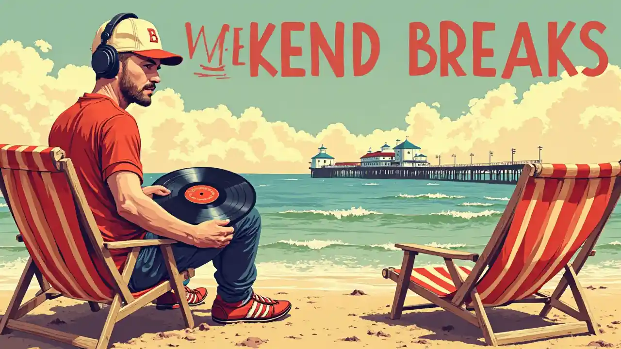 Una pubblicità per una città balneare nel Regno Unito con lettini e un molo, in uno stile di stampa degli anni '20, i colori dovrebbero includere il rosso ed essere vibrante come l'arte degli anni '60. Sulla sinistra dell'immagine dovrebbe esserci un DJ dall'aspetto moderno, con il cappello da baseball, con le cuffie, con in mano dei dischi di medie dimensioni. Dovrebbe esserci una zona centrale del testo che dice 'REPRESE DEL SETTEMANA'. L'area di testo non deve essere oscurata da altri elementi. Il testo dovrebbe essere in una font semplice come Gil Sans. L'immagine dovrebbe occupare i 2/3 superiori della tela, con un'area vuota sotto.