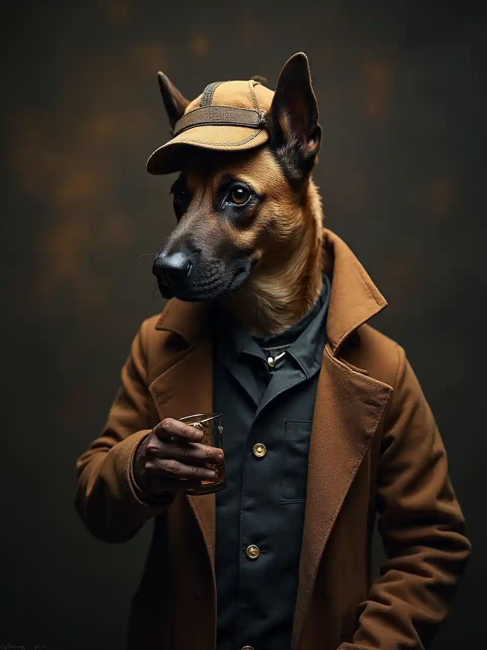 JaceIl pastore belga vestito come Sherlock Holmes. Come se pensassi mentre tieni una pipa. Fondo sfocato di una strada notturna.