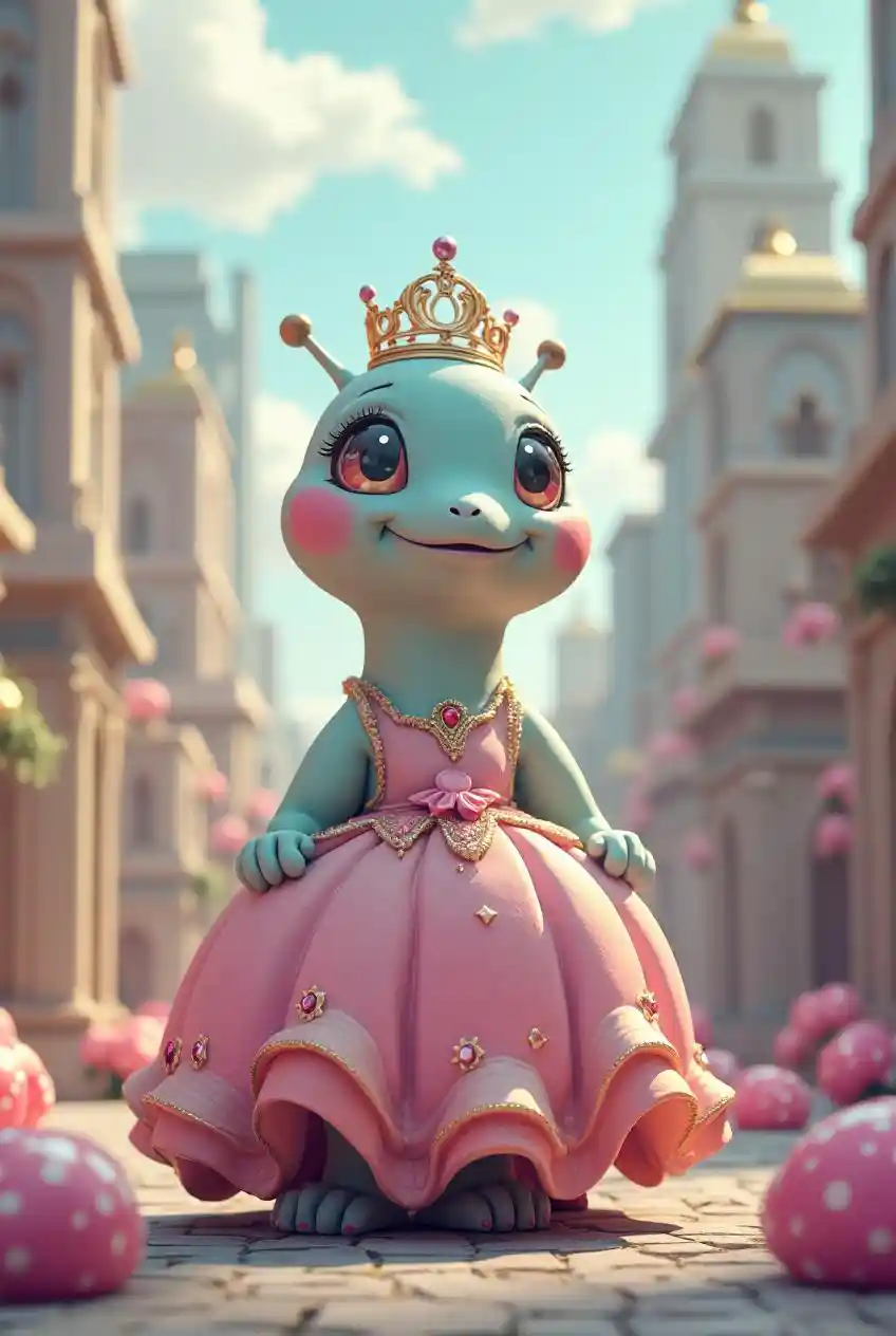 Un fantastico rendering 3D di una gran lumaca che indossa una tiara e un vestito da principessa con una grande torta cremosa tra grattacie, che sembra carina e adorabile, magica, di altro mondo, colori complimentari