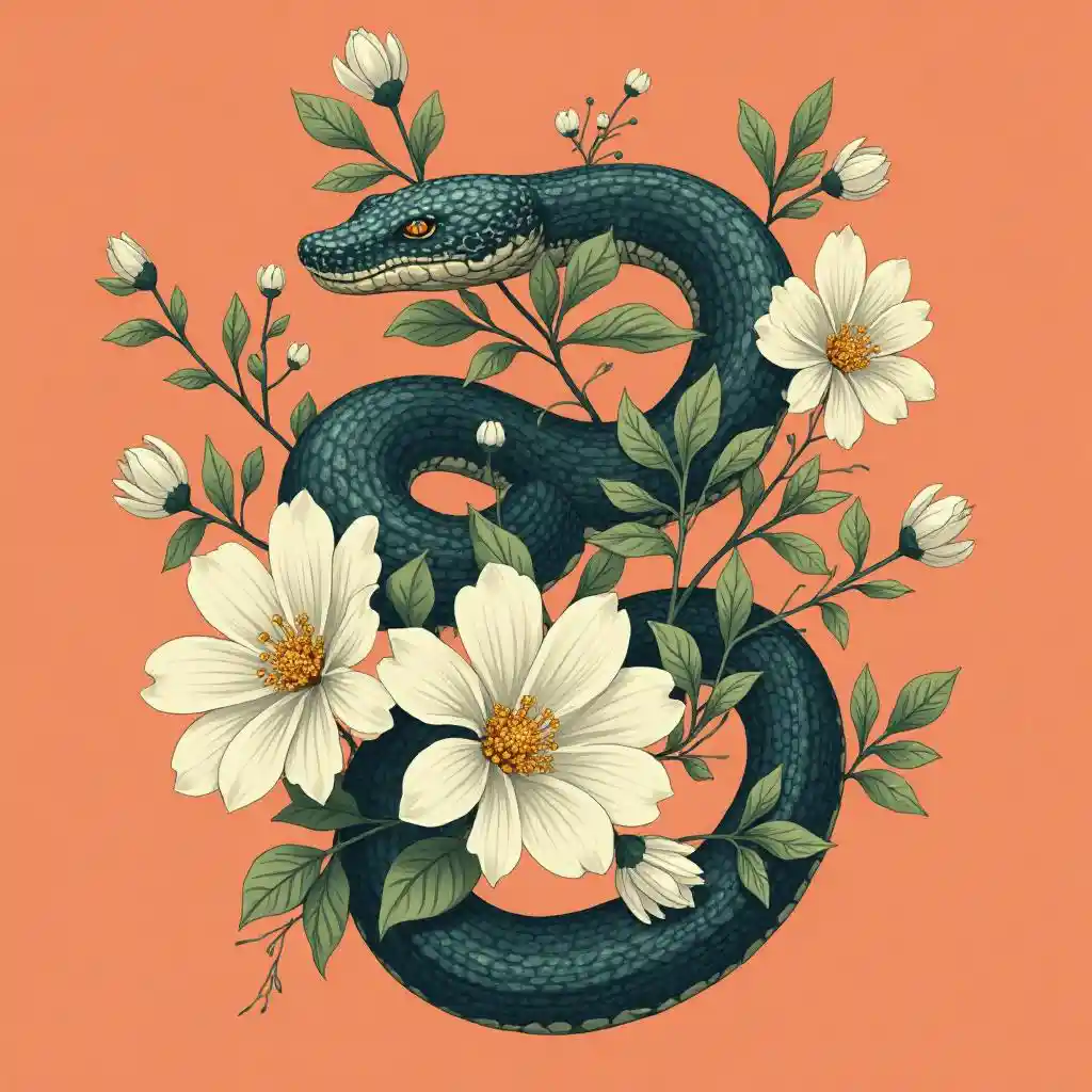 Questa immagine è un disegno digitale in uno stile di arte moderno stilizzato, con un serpente intrecciato con fiori delicati. Lo sfondo è di un solido colore arancione corallino, che contrasta con le tonalità verde e bianco del serpente e dei fiori. Il serpente è raffigurato con una forma elegante e sinuosa, le sue scaglie sono di colore verde scuro e nero, con sottili evidenze di struttura. La testa del serpente è rivolta verso l'osservatore, i suoi occhi vigili e leggermente ristretti, dando un senso di vigilanza e intelligenza. Circondato dal serpente ci sono grandi fiori bianchi a fiore pieno con petali complessi e dettagliate e foglie verdi. I fiori sono di un colore morbido e pastello, con foglie e steli verdi che si intrecciano con il corpo del serpente. Anche piccoli e delicati boccioli e grappoli di bacche sono sparsi in tutta la composizione, aggiungendo profondità e varietà agli elementi floreali. Lo stile complessivo è elegante e complesso, con un focus sull'interazione tra la forma naturale del serpente e la delicata bellezza dei fiori, creando un'immagine armoniosa ed equilibrata. L'immagine è un'impressionante e visivamente avvincente opera d'arte digitale.