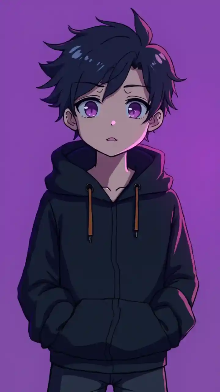 Figlio Jin Woo personaggio da anime solo livellamento in stile roblox e simile all'anime. Lo sfondo dovrebbe essere viola, e il personaggio stesso indossa una felpa nera e dovrebbe avere gli occhi viola