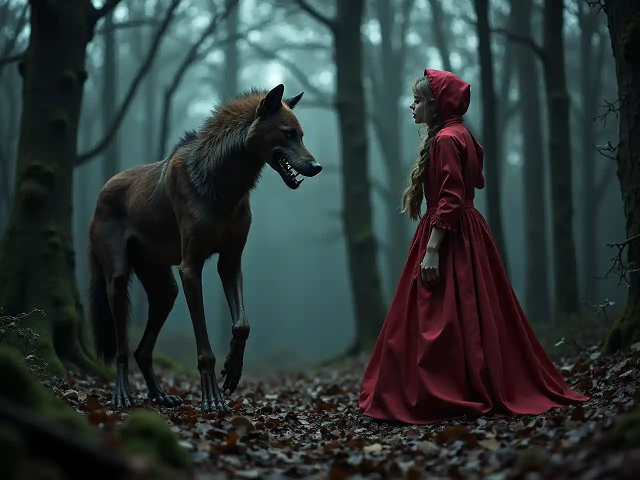 Cappuccio Rosso e il lupo scheletrico, in una foresta oscura e inquietante, umore, fotografia surreale.