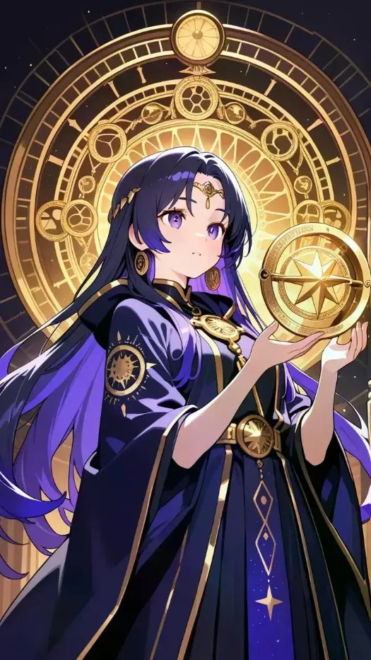 Antica star-priestess con i capelli di ossidiana in un cerchio d'oro, abiti di indigo profondo con zodiaco d'argento, allineando un astrolabe di ottone sotto un oculo a cupola, luce di luna, precisione sacra.