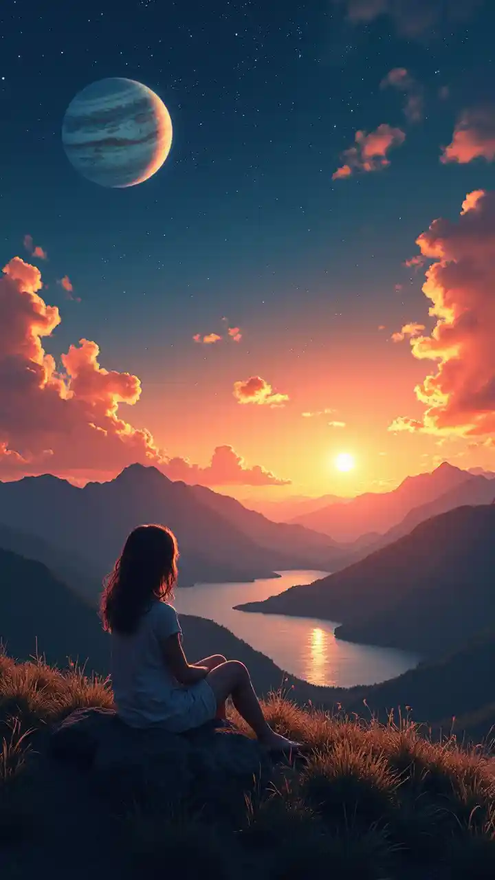 Ragazza seduta su una collina con vista sul cielo, stelle, pianeti, Giove. In un tramonto con un lago scintillante in fondo alla collina