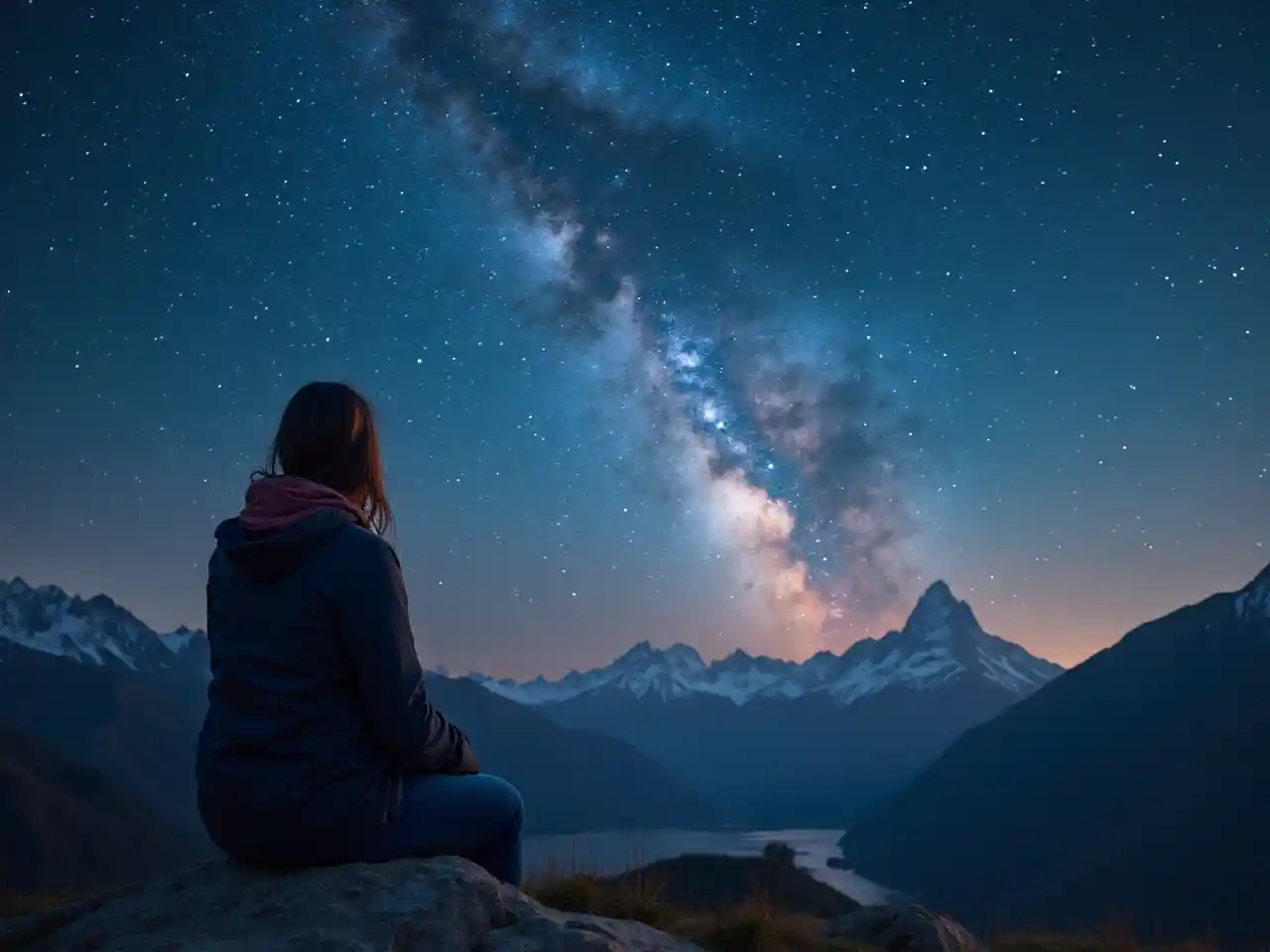 Una donna guarda il cielo stellato sopra le cime delle montagne