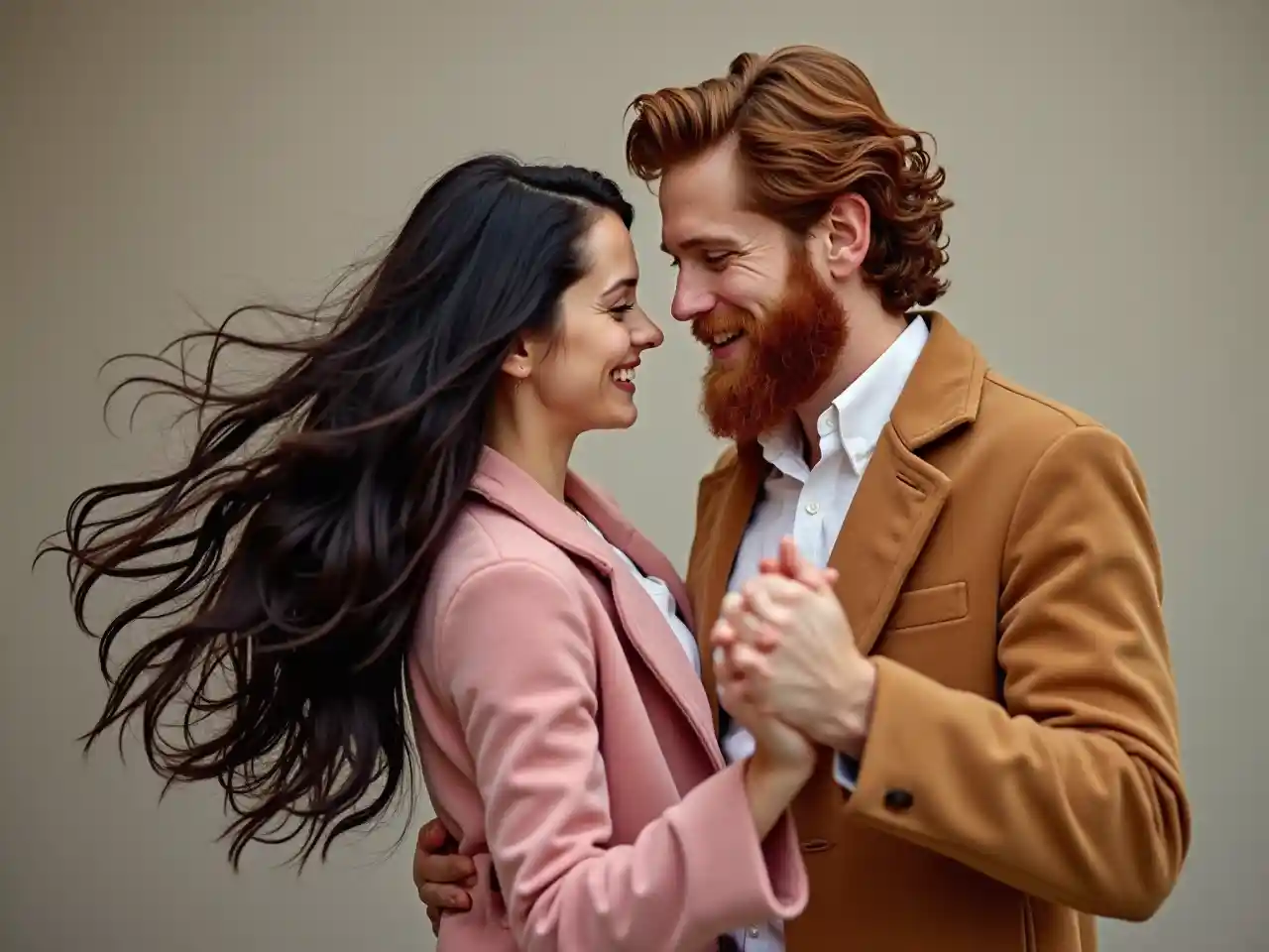Giovane bella coppia: donna con i capelli lunghi e neri e un cappotto rosa che danzano con un uomo con i capelli castani e la barba che indossa un cappotto di caramello, con una camicia bianca.