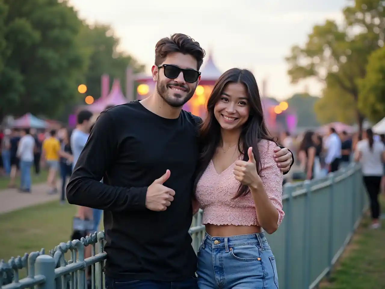 In piedi con fiducia, sullo sfondo dei preparativi per un evento, un giovane e una ragazza posano insieme, entrambi vestiti con. L'uomo, con gli occhiali da sole neri e una camicia nera con maniche lunghe, si appoggia a una recinzione mentre alza il pollice, mostrando un comportamento rilassato. Accanto a lui, la donna, in un top rosa chiaro, con un design complicato e jeans blu sbiaditi, rispecchia il suo gesto con un allegro pollice in su, i suoi lunghi capelli scuri. La scena si svolge all'aperto, con una vibrante scena visibile sullo sfondo, delineata da alberi verdi e da un cielo delicatamente illuminato che indica il tardo pomeriggio o la prima sera. L'atmosfera generale trasmette eccitazione e cameratismo, catturando un momento di gioia in mezzo a un ambiente energetico.
