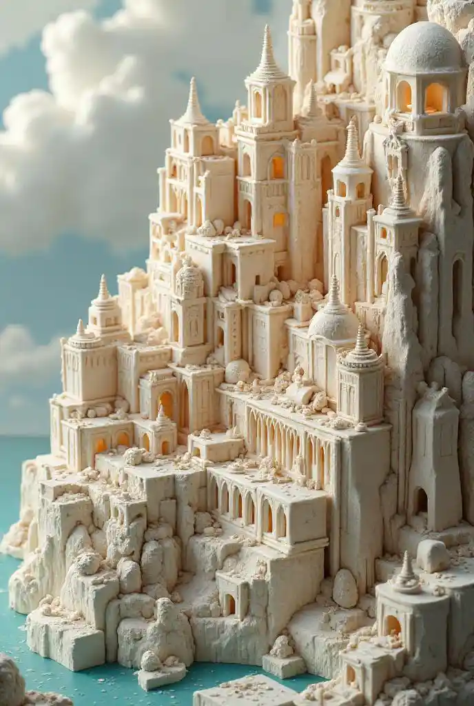 AsherCreare un'immagine isometrica raffigurante una città scavata in una scogliera, meticolosamente ricostruita usando dei. La città dei cubi di zucchero dovrebbe presentare un complesso