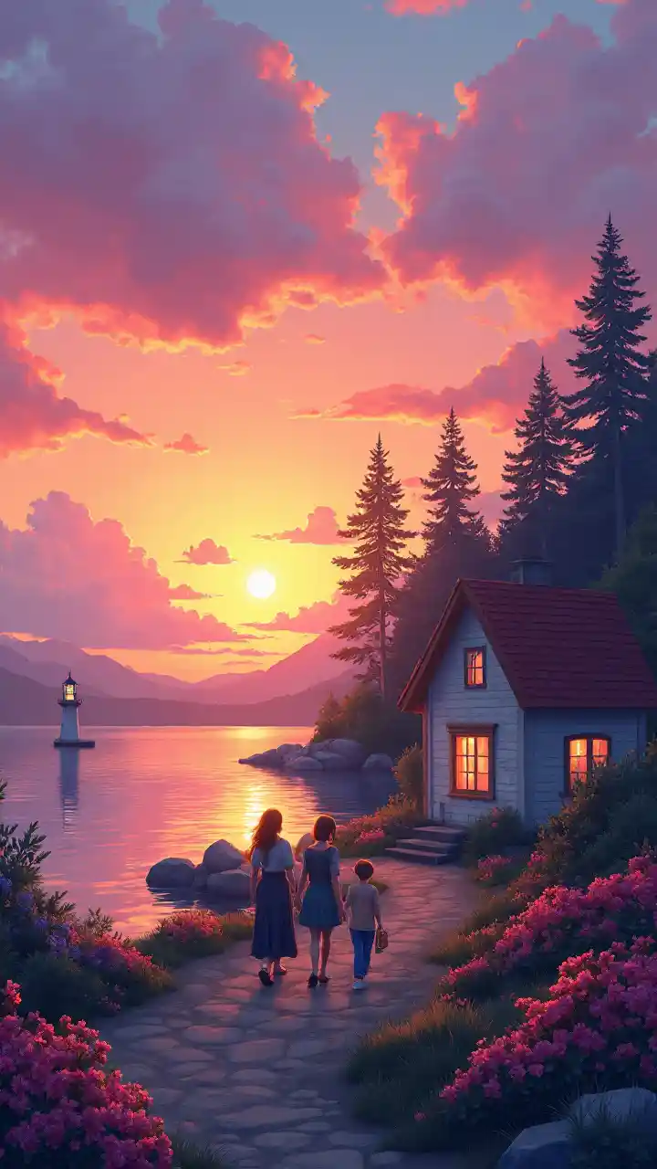 Una serena illustrazione di un tramonto sul lago con un faro nel mare, con vivaci sfumature di rosa, arancione e viola, una piccola e accogliente cabina con finestre luminose si trova sulla riva destra, circondata da fiori, il mare riflette il cielo colorato.Un uomo, una donna e un ragazzo stanno camminando di fronte alla casa vicino al faro. il tramonto dietro le montagne distanti, atmosfera calma, capolavoro, alta qualità.