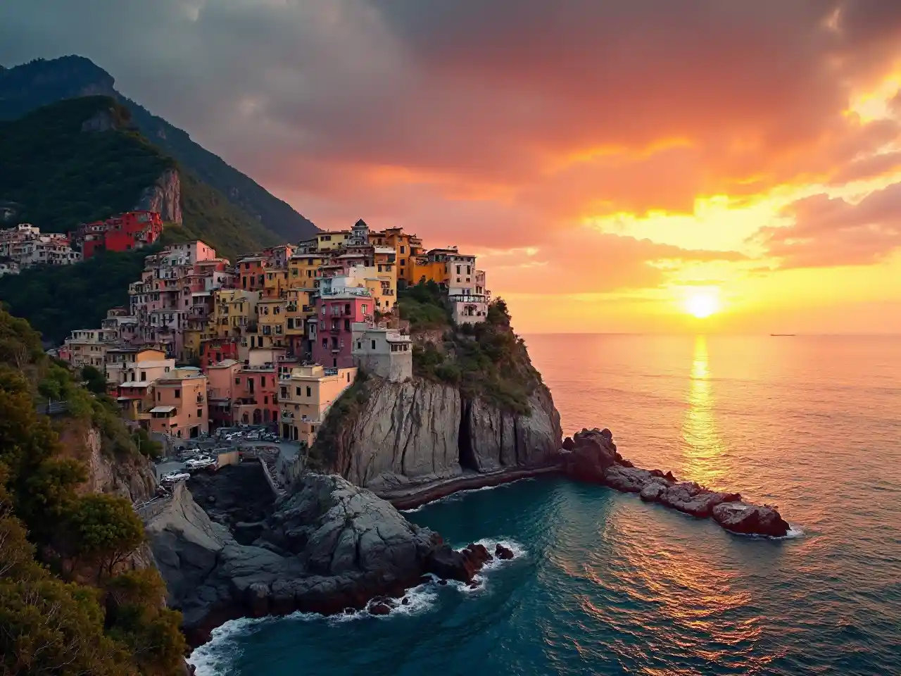 Un tramonto impressionante, con le sue colorazioni calde in contrasto con lo sfondo di una montagna aspra, la scena si svolge con la vista del (oceano) che incontra il cielo, a poca distanza, immerso tra le colline, è un villaggio sereno e pittoresco, immerso sul bordo della montagna. La sua architettura pittoresca e i suoi colori vibranti aggiungono un tocco accogliente al paesaggio, creando un ambiente perfetto per una (fotografia del paesaggio), ultra ampio angolo, colori vivaci, HDR, 8K, epico, luce volumetrica, iper dettagliata, di qualità, illuminazione dinamica, sfondo cinematografico che emana calore e