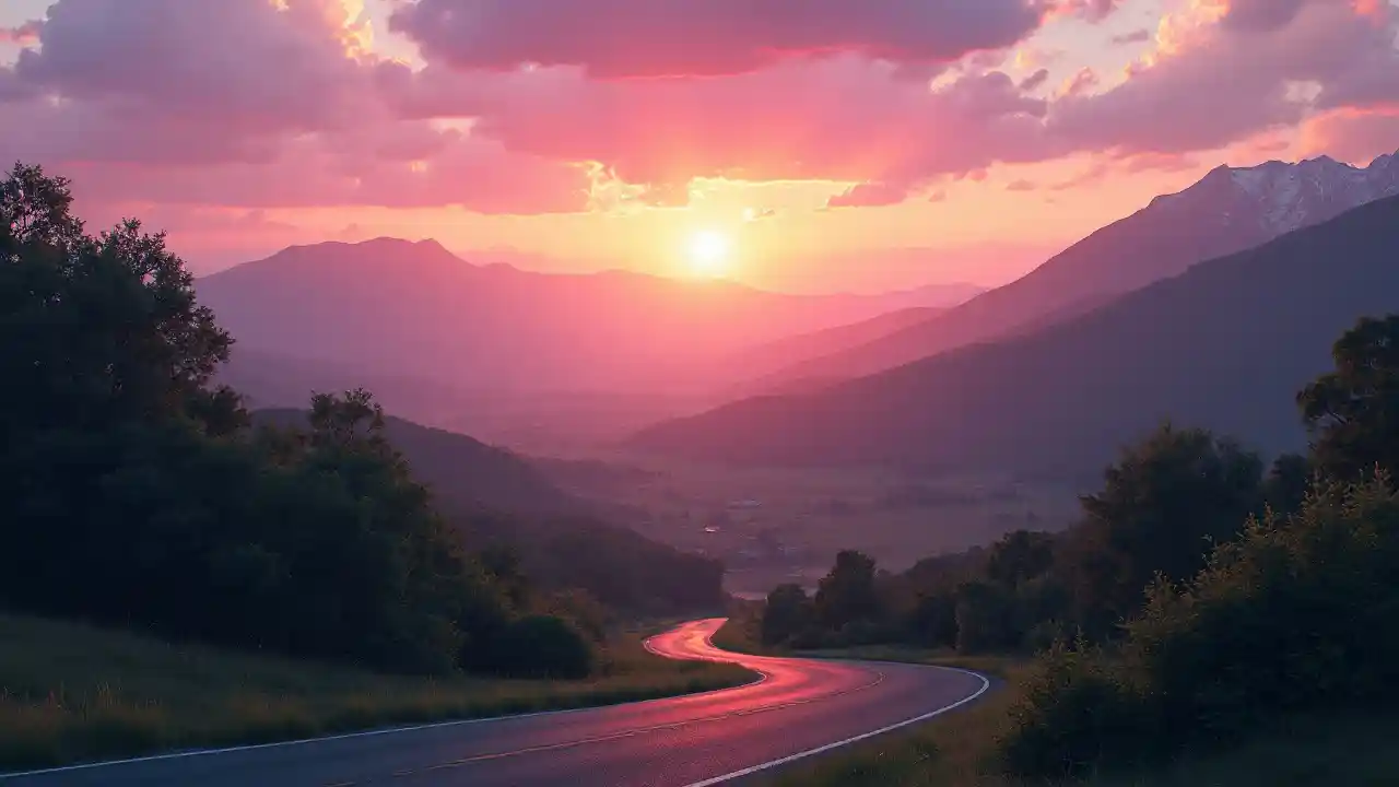 JacobLa scena è affascinante: le sfumature rosa e viola del tramonto proiettano lunghe ombre sulla verde valle e sulla tortuosa strada.