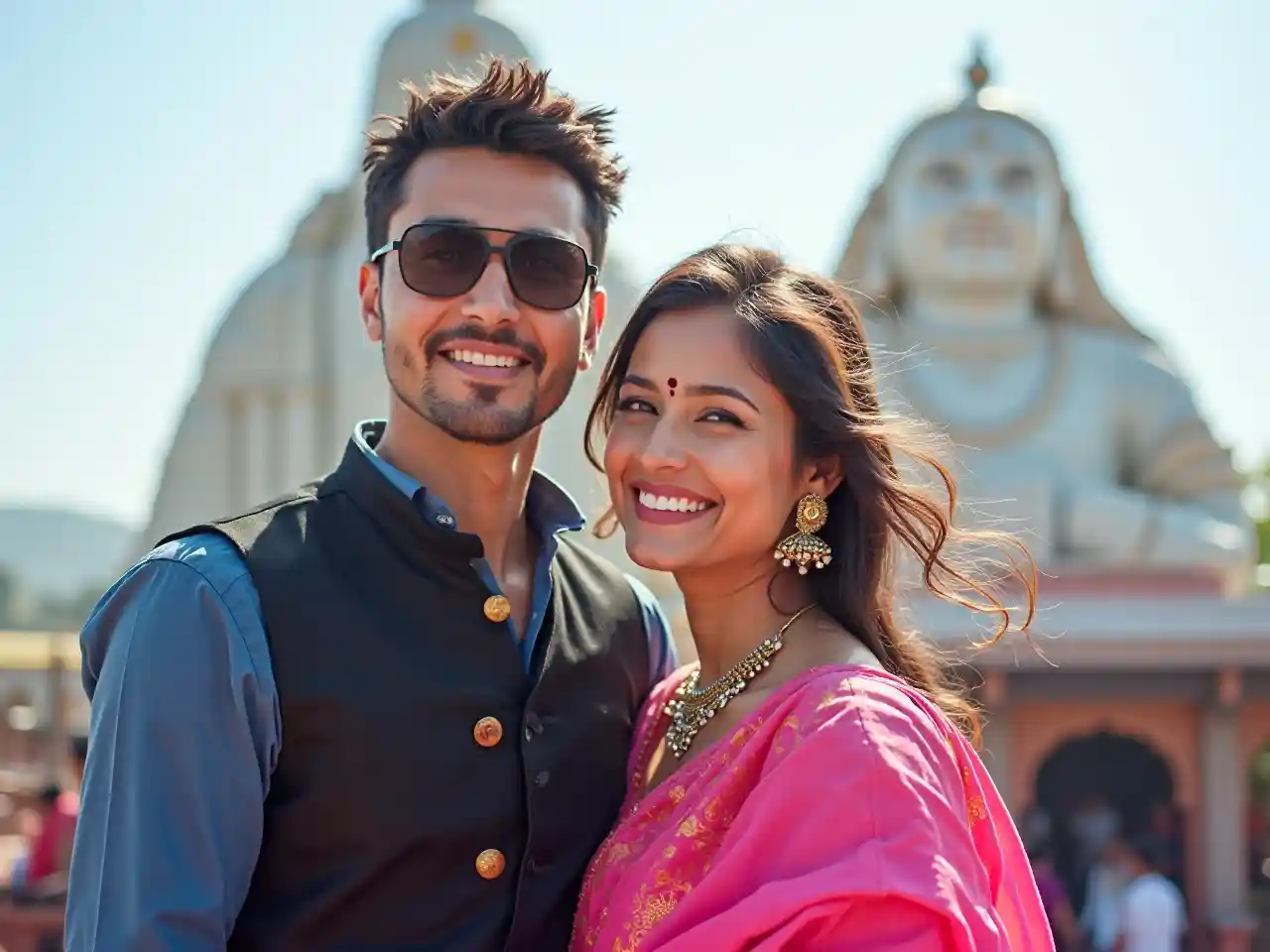 Bagnati dalla luce del sole, un uomo e una donna posano insieme allegramente davanti a una grande statua, presumibilmente di una divinità indù, che sta maestosamente dietro di loro. L'uomo, con gli occhiali da sole e un giubbotto nero sopra una camicia blu, trasmette un senso di sicurezza mentre la donna irradia calore in un abito tradizionale rosa, ornata con gioielli che completano il suo abito. I suoi capelli sono stilizzati con eleganza, con un punto decorativo sulla fronte che aggiunge un tocco di cultura. Lo sfondo è caratterizzato da un cielo limpido e da indizi di un ambiente movimentato, forse un tempio o una vista panoramica, che esalta l'atmosfera di festa in occasione di questo momento. La composizione complessiva cattura uno spirito gioioso, fondendo il sacro con il legame personale attraverso i loro sorrisi.