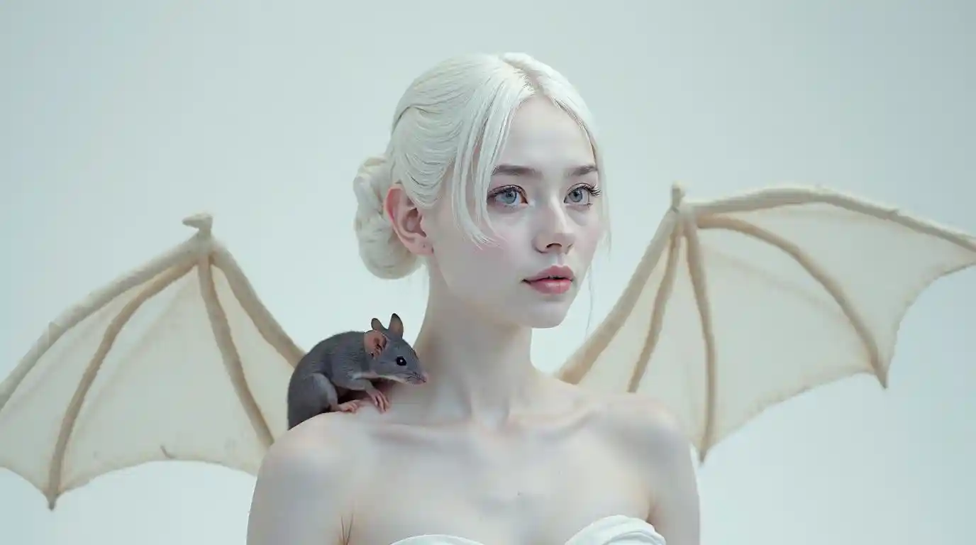 Un ritratto in alta risoluzione in 8K (ar 103:128) di un uomo albinos con le ali di un pipistrello, capelli e pelle bianchi come la porcellana e occhi rosa. Un piccolo topo grigio si appoggia dolcemente sulla spalla. Fotografato in uno studio ben illuminato con uno sfondo bianco senza cuciture, che enfatizza l'eleganza surreale senza connotanti sessuali.