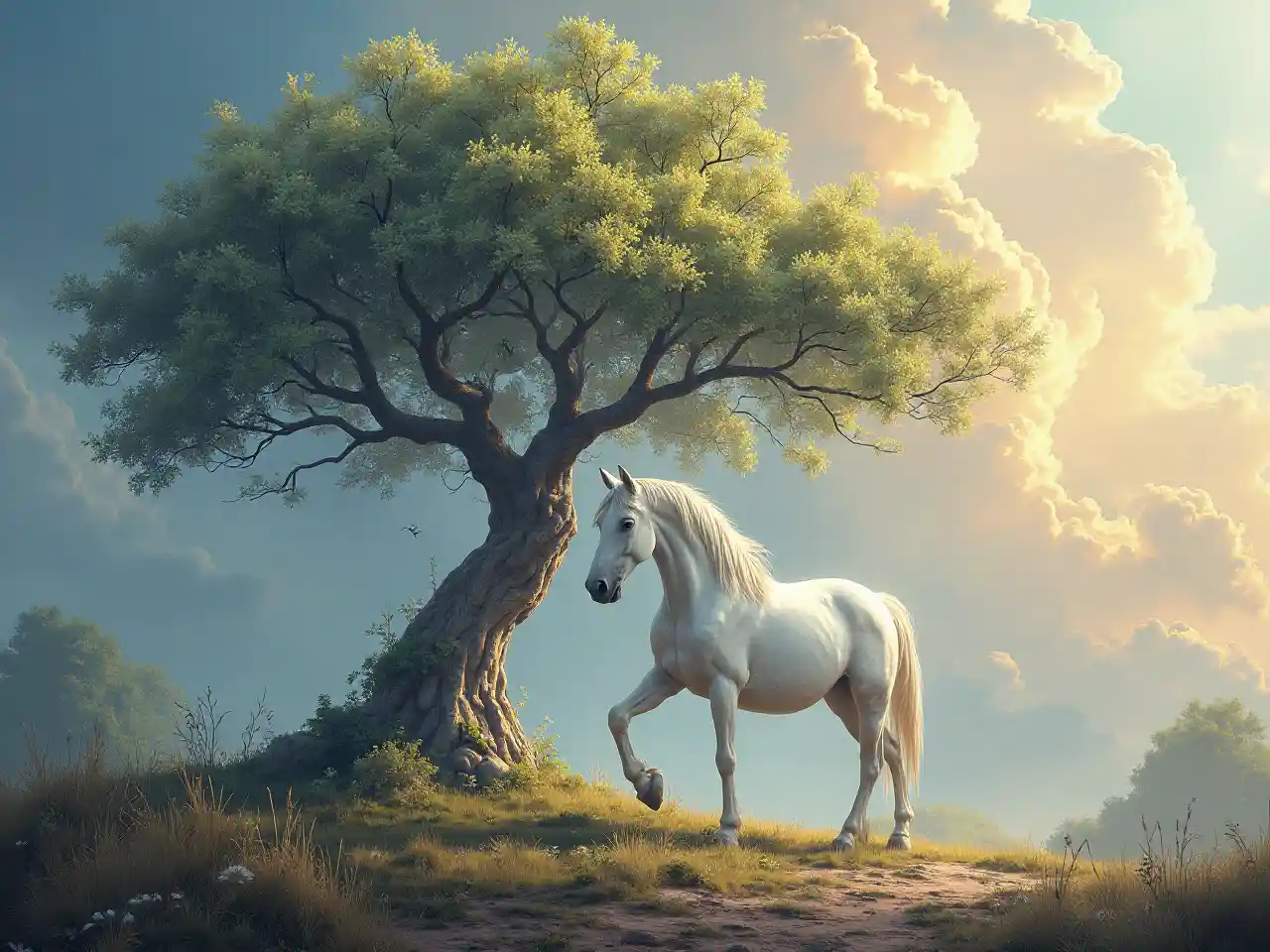 Rappresentazione surrealistica di Madre Terra, maestoso cavallo bianco in piedi con grazia accanto a un albero vivace e tentacolare, paesaggio da sogno con colori morbidi e iridescenti, intricati modelli sullo sfondo, atmosfera pacifica ed etere, luce incantevole che illumina la scena, ultra dettagliato, cattura l'essenza della natura e la mistica, qualità da sogno, invito all'immaginazione.