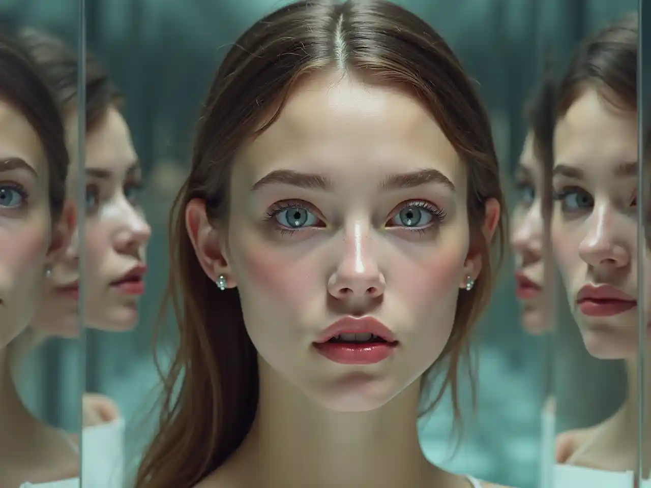 Una serie di bellissimi volti femminili nello stile del surrealismo digitale. Una griglia simmetrica di un gruppo di donne con colori degli occhi e le labbra diverse davanti a un labirinto di specchi.