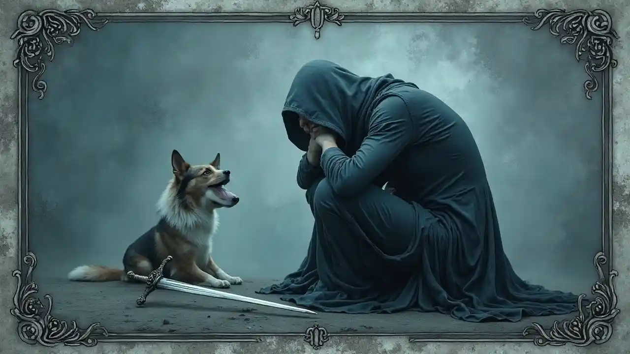 Crea una carta del Tarot, 10 di Spade, con uno sfondo blu-grigio dominante che evoca un senso di malinconia e di introspezione. Al centro, una figura, avvolta dalle ombre, con il volto oscurato, siede in una posa contemplativa, trasmettendo un senso di rassegnazione e disperazione. Accanto a loro, un leale border collie, con uno sguardo penetrante, siede attento, la sua pelliccia una presenza calda e confortante. Nell'angolo inferiore sinistro, una sola spada d'argento lucente giace scartata, la sua lama puntata lontano dalla figura, come se simboleggiasse l'abbandono della paura. La carta è circondata da un delicato telaio ornato da intricati disegni curvi che evocano un senso di misticismo e di saggezza antica. L'umore generale è quello di introspezione cupa e di tranquilla contemplazione.