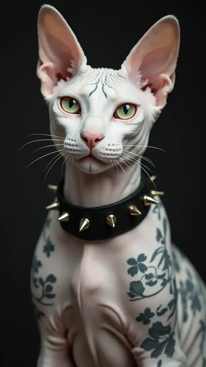 gatto sfinge bianco e coraggioso, coperto di tatuaggi, con col nero e con spine
